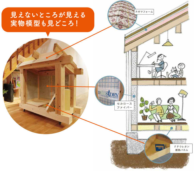 ムクのイエで実際に床、壁、屋根に使われている断熱材の実物模型を公開中です。