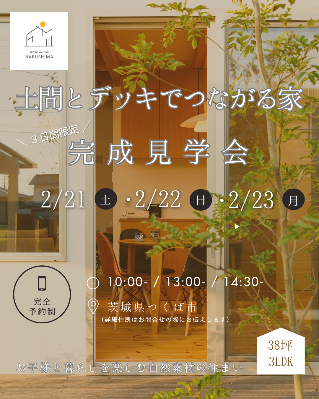 **お子様と住まう3人暮らし(38坪・3LDK)**のリアルなサイズ感を、ぜひ現地でご覧ください。